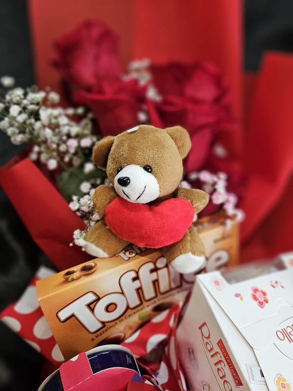 Romantično Srce – Buket s Medvjedićem i Slatkišima, Tražiš savršen poklon koji će istovremeno prenijeti ljubav, pažnju i slatku nježnost? Predstavljamo ti “Romantično Srce” – buket koji je više od običnog cvjetnog aranžmana. U ovom jedinstvenom daru stapaju se ručno birani cvjetovi, omiljeni slatkiši i preslatki plišani medvjedić – sve umotano u elegantnu crvenu ambalažu koja odiše strašću i toplinom.