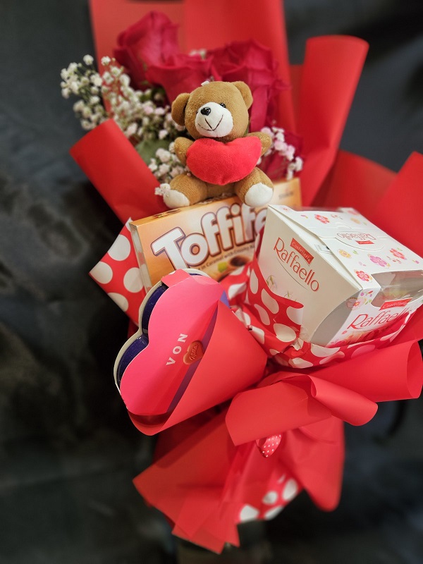 Zahvaljujući pažljivoj kompoziciji boja, tekstura i dodataka, “Romantično Srce” ostavlja snažan vizualni i emotivni dojam. Osim što oduševljava izgledom, ovaj buket pruža i senzorno iskustvo kroz miris svježeg cvijeća i užitak u omiljenim slatkišima.
